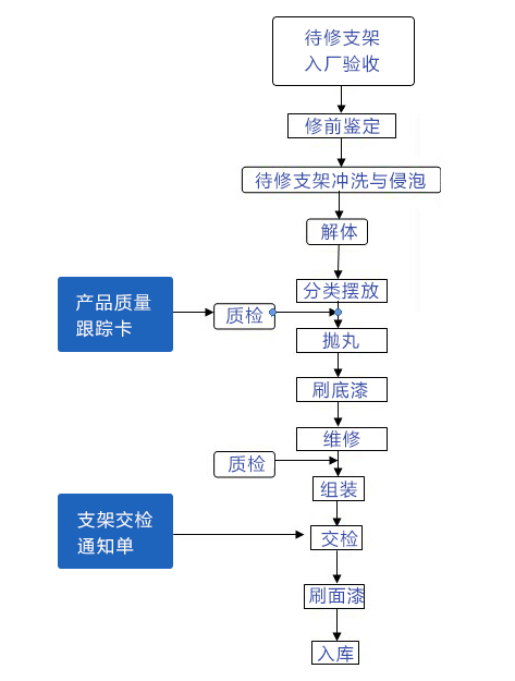 对解体的液压支架各部件进行分类摆放,质检对拆解后的各部件进行修前检验,按质检结果分类维修各部件。按质检结果维修各部件,避免各部件漏修、少修项目,提高维修效率,提高维修后交检合格率;填写《部件类产品质量跟踪卡》。